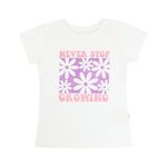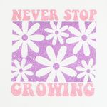 Remera urbana para niñas, ideal para un look fresco, moderno y lleno de estilo en el día a día. Esta remera de manga corta color blanco destaca por su gran estampado central con la frase “NEVER STOP GROWING” en rosa brillante. En el centro se encuentra un cuadro morado brillante con diseño de flores blancas estilo retro/hippie, aportando un toque divertido, delicado y lleno de personalidad. Su diseño Day To Day garantiza comodidad y libertad de movimiento, perfecta para actividades cotidianas, juegos y paseos.