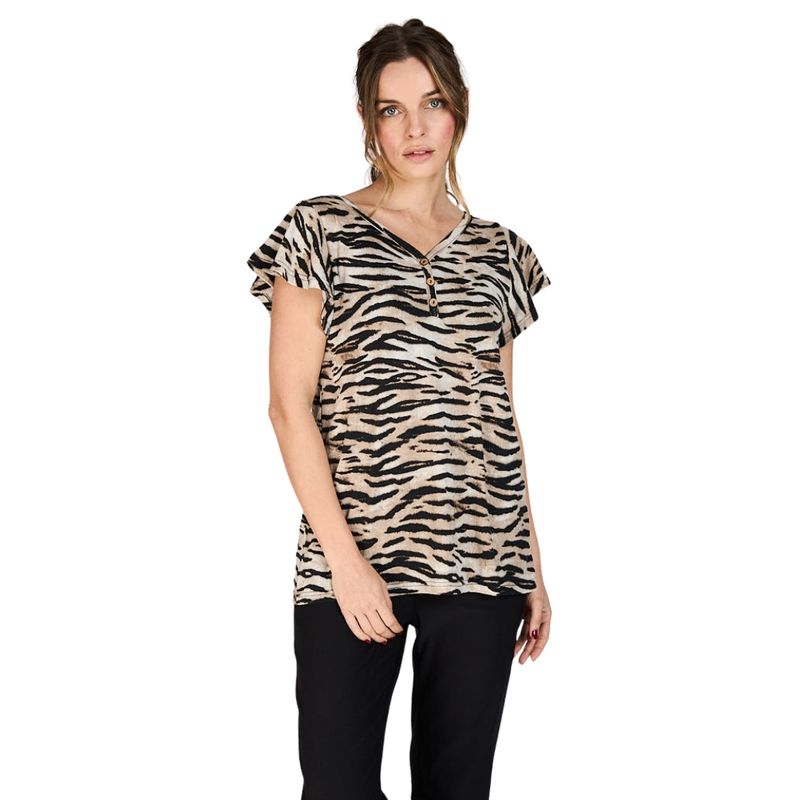 La Remera Manga Corta Estampado De Zebra Pia Woman es la combinación perfecta entre comodidad, elegancia y tendencia. Su estampado de cebra en tonos beige, blanco roto y negro aporta un estilo moderno y sofisticado, ideal para quienes buscan destacarse con detalles originales en su vestimenta. El escote en V, acompañado de tres botones de madera en la parte frontal, aporta un toque de distinción que hace que esta prenda sea versátil y atractiva para diversas ocasiones.
