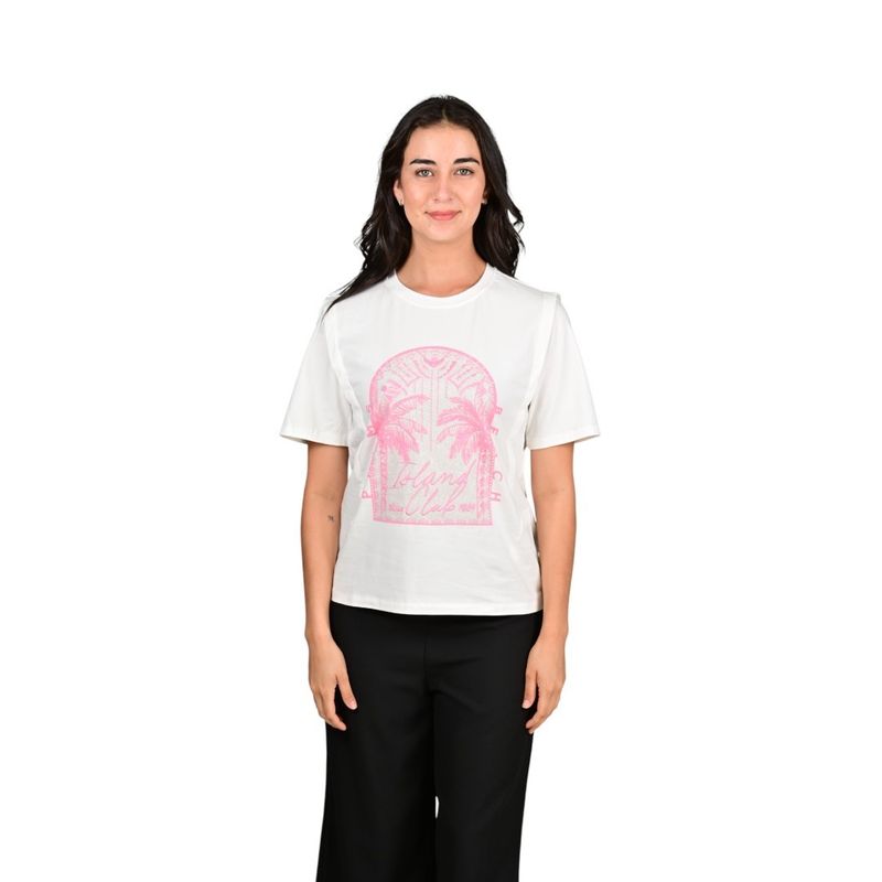Presenta un estampado Island Club con dos palmeras que aporta frescura y dinamismo al conjunto. El acabado en brillos le da un sutil efecto luminoso, destacando la prenda de manera elegante y moderna. Su calce cómodo permite adaptarla fácilmente a diferentes estilos, desde casuales hasta salidas más arregladas.