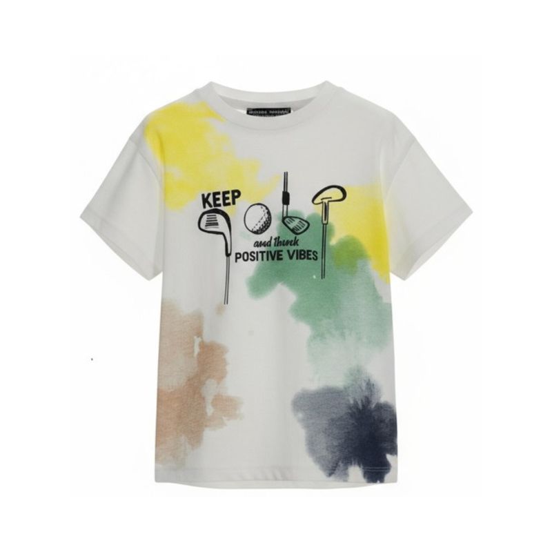 Esta remera manga corta Original Marines combina un diseño alegre con un toque artístico, ideal para los niños que disfrutan de la comodidad y el estilo. Su estampado frontal presenta manchas tipo acuarela en tonos vibrantes de amarillo, verde, marrón y azul, junto a un divertido dibujo de golf con la frase “KEEP and think POSITIVE VIBES”, que transmite energía positiva y frescura.