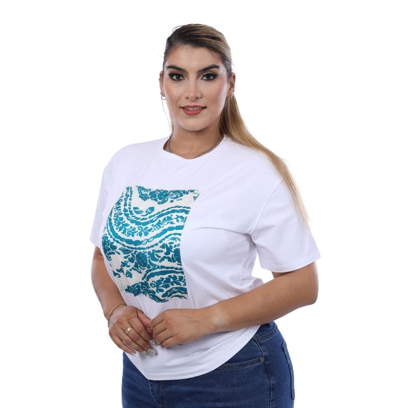 Esta remera cuenta con cuello redondo y manga corta, ofreciendo un calce cómodo y versátil. El diseño se destaca por su estampado cuadrado en el centro con motivos florales y ornamentales en tono verde azulado, creando una estética armoniosa y relajada que combina lo clásico con lo moderno.