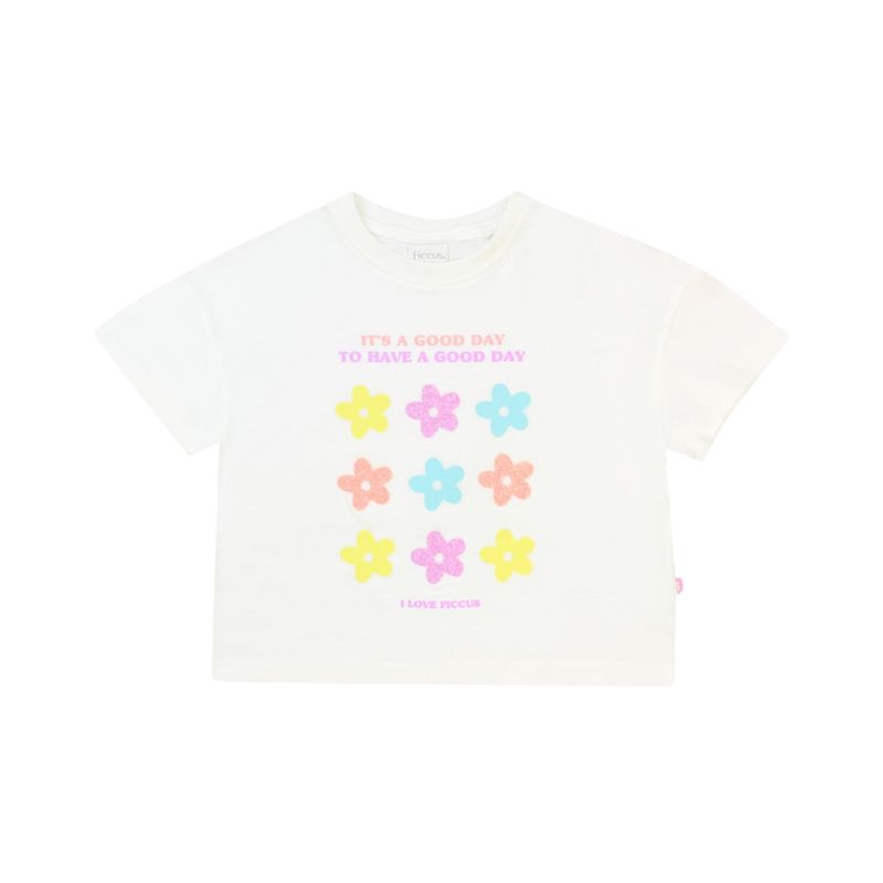Esta Remera Manga Corta Essence para niñas es una prenda tipo top que combina comodidad y estilo urbano. Su diseño presenta un estampado frontal de nueve flores de colores con acabado glitter, acompañado de los textos “Its a Good Day To Have a Good Day” e “I Love Ficcus”, que le dan un toque divertido y alegre para el día a día. El cuello redondo aporta un ajuste cómodo y versátil, ideal para combinar con diferentes prendas.