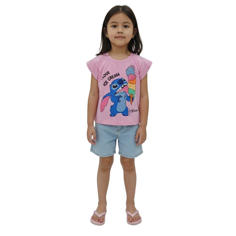 Estilo y Diseño: Esta remera para niña presenta un diseño divertido y alegre con un gráfico frontal de Stitch disfrutando un helado, ideal para sumar un toque infantil y casual al look diario. Cuenta con cuello redondo y mangas cortas tipo ala, que aportan frescura y un estilo encantador.