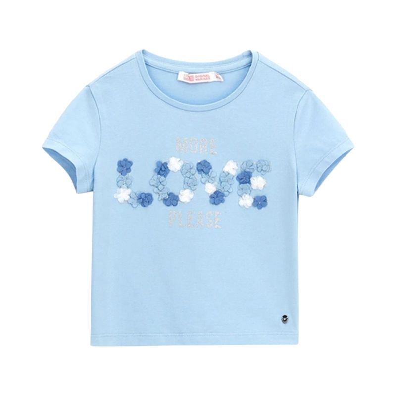 La Remera Manga Corta Love Mademoisel Celeste Niña Original Marines es una prenda encantadora que combina delicadeza y diversión en un diseño moderno para niñas. Su color celeste suave aporta frescura y versatilidad, ideal para crear looks alegres y cómodos. El detalle principal frontal, con la frase "MORE LOVE PLEASE" y el destaque de "LOVE" formado por apliques de flores 3D blancas y azules, le da un toque creativo y único que encantará a las pequeñas.