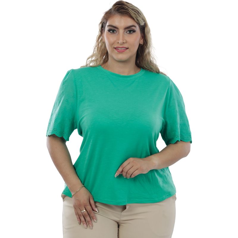La Remera Manga Corta Mangas Con Broderie Verde Mujer Susan Miller es perfecta para quienes buscan combinar estilo romántico con comodidad y versatilidad en su vestuario diario.