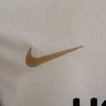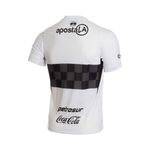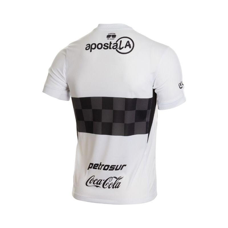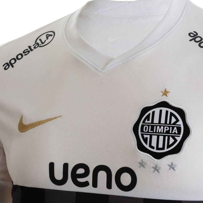 Su estética se destaca por la base blanca clásica, acompañada de una franja frontal negra con patrón cuadriculado que aporta un toque innovador sin perder la identidad del club. En el pecho se luce el escudo oficial de Olimpia, acompañado de la estrella dorada y las tres estrellas plateadas que representan los máximos logros internacionales del club.
