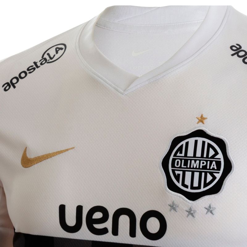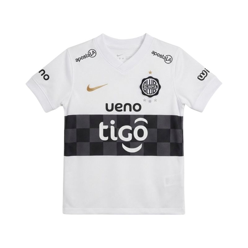 Su diseño mantiene los colores icónicos del club: blanco con detalles en negro y dorado metálico, destacando el escudo oficial del Club Olimpia y las estrellas que celebran los logros internacionales más importantes. El tejido de poliéster ligero y transpirable asegura frescura, ventilación y durabilidad, convirtiéndola en una opción ideal para acompañar a los niños en sus actividades deportivas o uso casual.