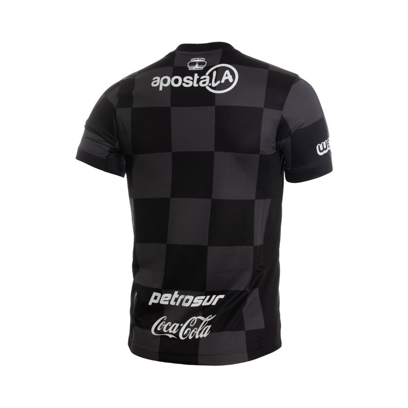Esta rembera se distingue por su patrón cuadriculado en distintos tonos de negro y gris oscuro, que aporta profundidad visual y un acabado contemporáneo. En el pecho se luce el escudo oficial del Club Olimpia, acompañado de la estrella dorada y tres estrellas plateadas que representan los máximos logros internacionales del club. Los logos del patrocinador técnico en dorado y los sponsors impresos en blanco crean un contraste elegante y equilibrado, reforzando su carácter oficial y coleccionable.