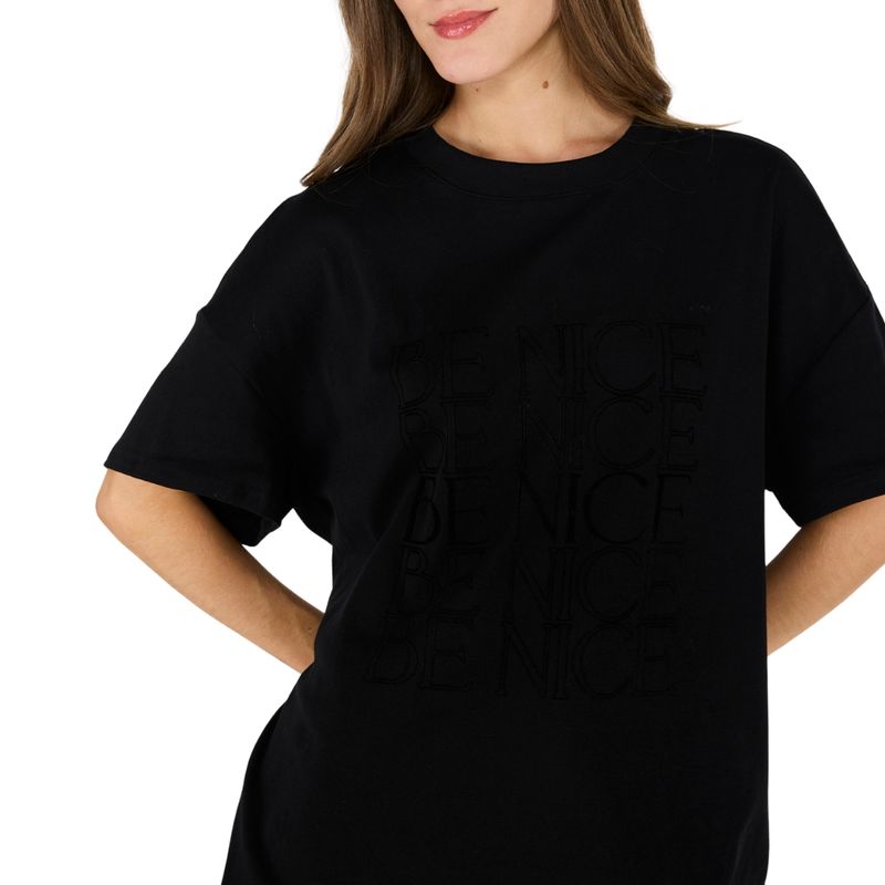 La remera Be Nice de Atrevida combina comodidad y estilo urbano, siendo perfecta para quienes buscan un look relajado pero moderno. Su diseño frontal con la frase “BE NICE” en relieve tonal aporta un detalle distintivo que realza la prenda sin perder sencillez.
