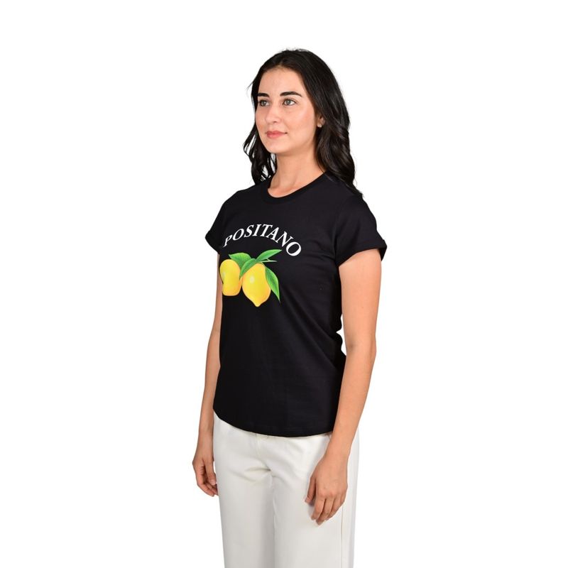 Remera de corte clásico con mangas cortas y cuello redondo, diseñada para brindar comodidad y estilo en el día a día. Su estampado de limones amarillos junto al texto "POSITANO" en blanco le aporta un toque fresco y divertido, ideal para looks casuales y modernos.
