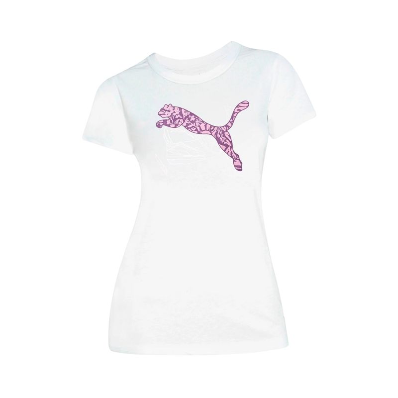 Su color blanco luminoso ofrece versatilidad y frescura, mientras que el diseño estampado de gran tamaño en el centro del pecho resalta la silueta del emblemático felino Puma en plena acción de salto. El interior de esta silueta presenta un patrón abstracto y orgánico en tonos rosas y morados con detalles en blanco, aportando dinamismo y un estilo único que destaca por su originalidad.