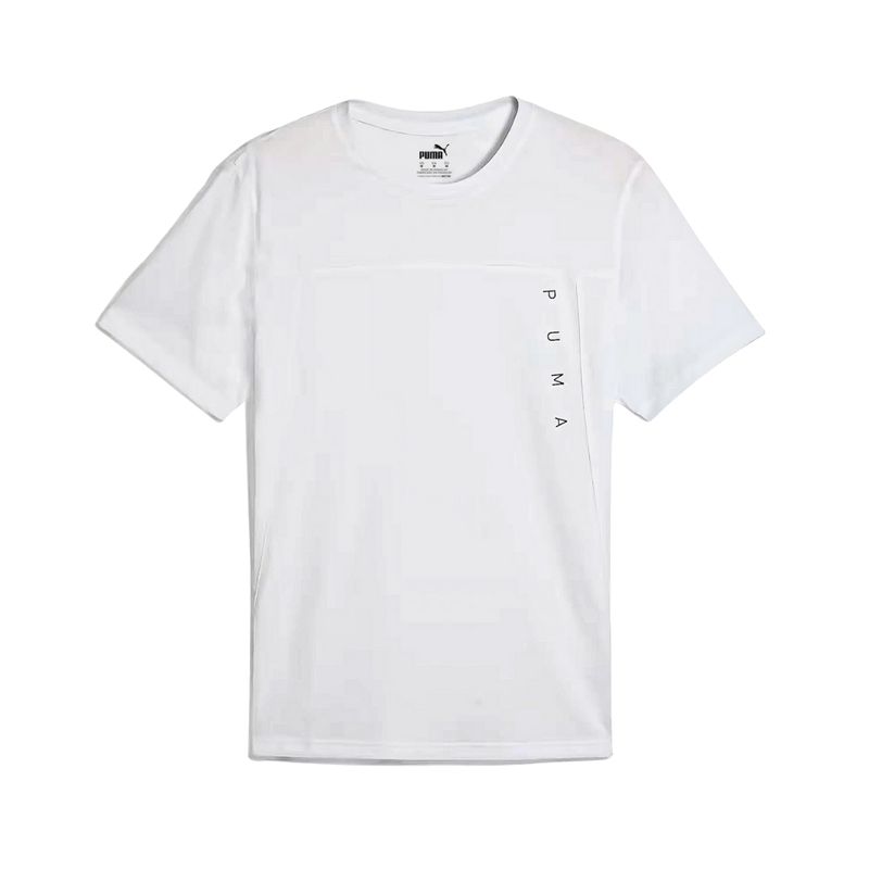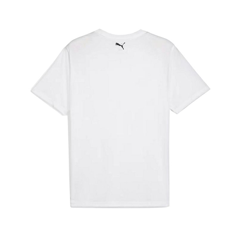 Destaca por su diseño minimalista, con una línea horizontal y el nombre “PUMA” impreso verticalmente en negro a la derecha. El color blanco permite combinarla fácilmente con pantalones deportivos, shorts o joggers para un estilo limpio y moderno.
