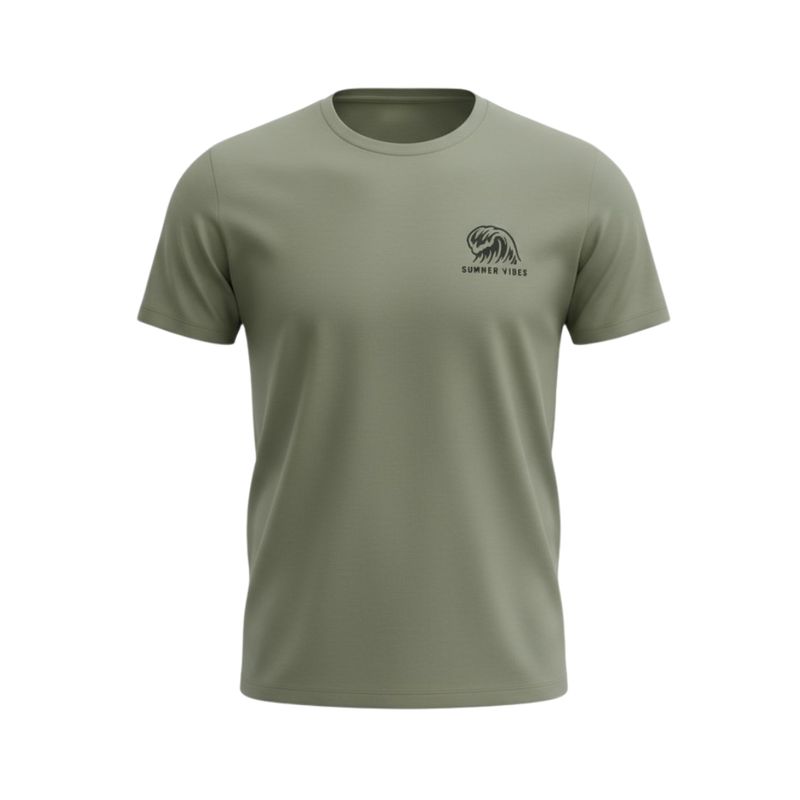 Remera de manga corta para hombre con un diseño moderno y fresco, ideal para el verano y actividades informales. Cuenta con un cuello redondo clásico que aporta comodidad y versatilidad. El frente presenta un pequeño estampado negro de una ola acompañado de la frase "SUMMER VIBES", mientras que la espalda repite el mismo motivo de ola con los textos "CATCH THE WAVE" y "SUMMER VIBES", creando un efecto visual atractivo y armonioso.