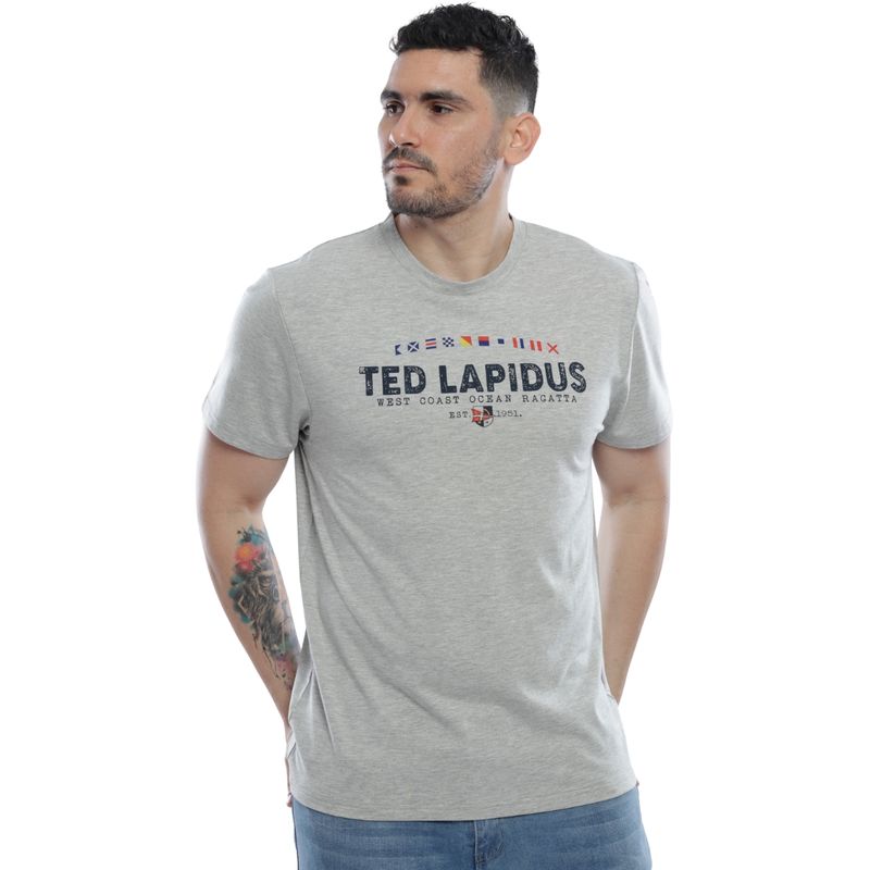 Remera masculina de manga corta con cuello redondo clásico, diseñada para brindar comodidad y estilo en cualquier ocasión casual. Su color gris claro jaspeado aporta un toque moderno y versátil, mientras que el estampado frontal refleja un estilo náutico elegante: texto en azul oscuro acompañado de una hilera de banderas de señalización marítima en colores, creando un diseño distintivo y fresco que aporta personalidad y sofisticación a tu look.