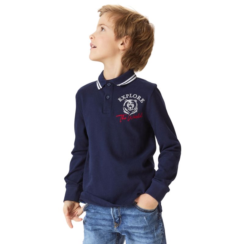 Las mangas largas finalizan en puños acanalados en azul marino, ofreciendo un acabado cómodo y seguro para acompañar la movilidad natural del niño.