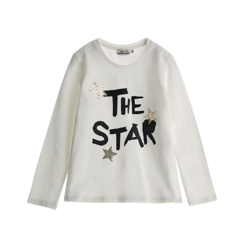 Esta remera de manga larga para niña se destaca por su diseño moderno y lleno de brillo. Confeccionada en color blanco, presenta un corte clásico con cuello redondo y mangas largas de caída recta, ideal para los días frescos o para lucir con estilo en cualquier ocasión.