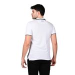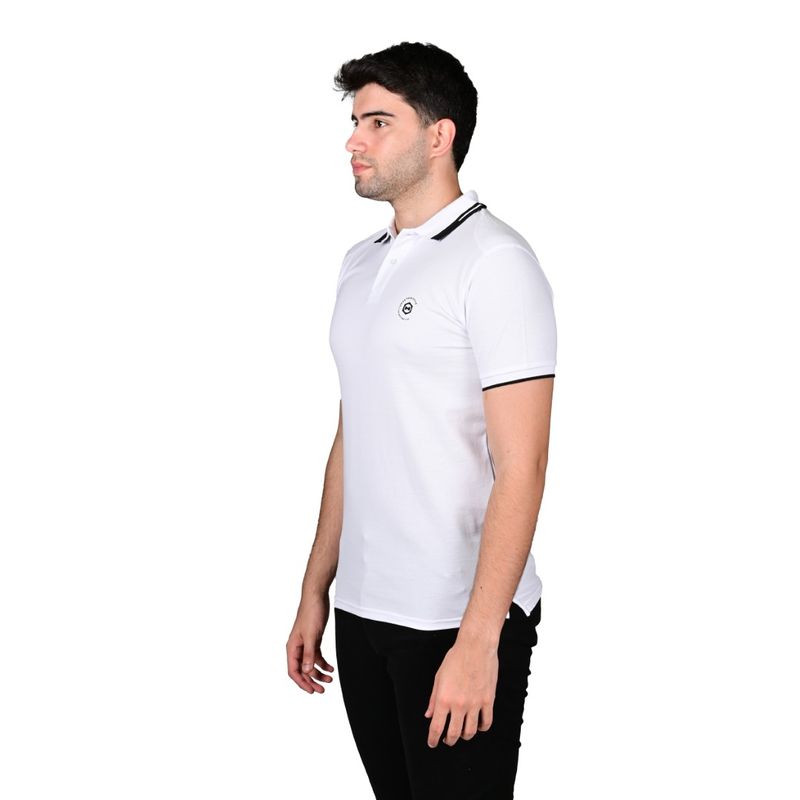 Esta polo blanca presenta ribetes en contraste negro y blanco en el cuello y los puños, aportando un detalle distintivo y elegante. El cierre de dos botones permite un ajuste cómodo y práctico, mientras que el logo circular bordado en el pecho agrega un toque sutil de identidad de marca. Perfecta para actividades diarias, encuentros sociales y salidas casuales.