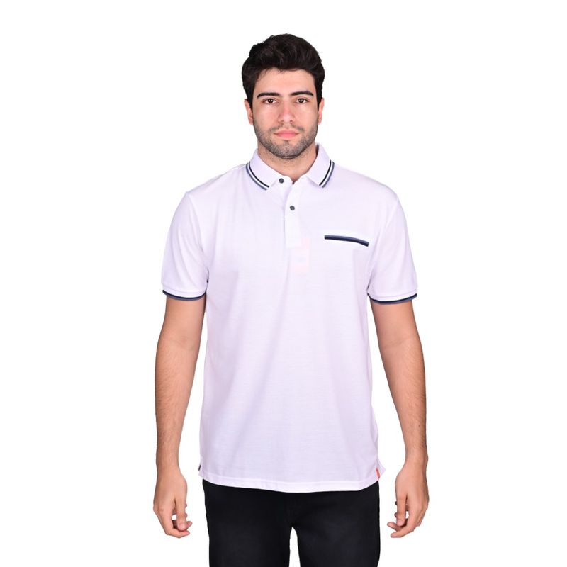 El cuello tipo polo blanco incorpora dos franjas horizontales en azul oscuro, que aportan un toque visual refinado sin perder sobriedad. La tapeta de botones, también blanca, mantiene una continuidad armónica con el cuerpo de la prenda. En el lado izquierdo del pecho, se encuentra un bolsillo de parche horizontal en color azul oscuro, que además de funcional, añade estilo y carácter al diseño.