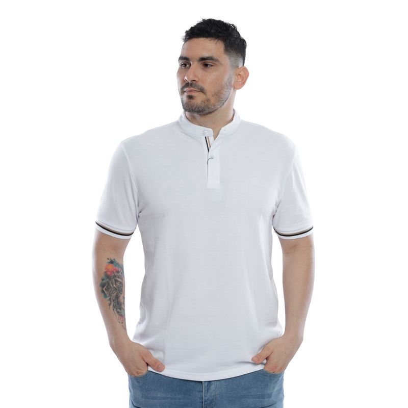 Remera polo de manga corta con un diseño clásico y elegante, ideal para quienes buscan versatilidad y confort. Presenta cuello mao con tapeta de botones, permitiendo ajustar la apertura según la ocasión y el estilo deseado. Los ribetes con finas líneas oscuras y blancas en el borde de las mangas añaden un detalle sutil y sofisticado que realza la prenda sin sobrecargarla. Perfecta para looks casuales, urbanos y semi-formales.