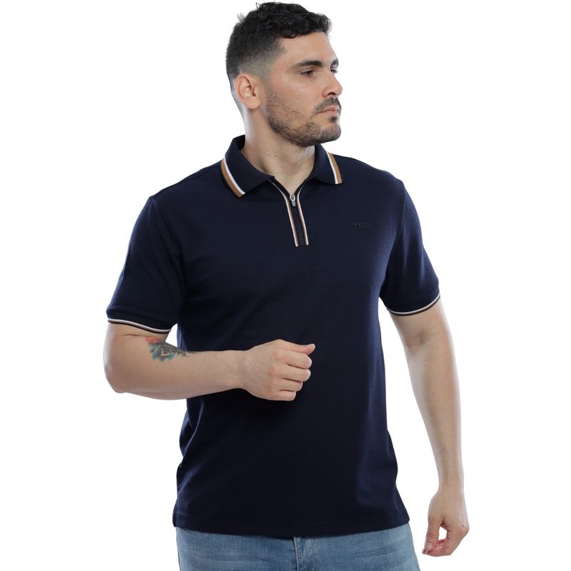 Remera polo masculina de manga corta en color azul marino oscuro liso, diseñada para un look moderno y sofisticado. El cuello acanalado incluye franjas decorativas en blanco, beige/naranja y azul marino, agregando un detalle visual elegante y contemporáneo. La tradicional tapeta de botones ha sido reemplazada por una cremallera corta con franjas decorativas a los lados, aportando funcionalidad y estilo distintivo. Los puños acanalados incluyen franjas en blanco y beige/naranja, creando contraste y personalidad al diseño general de la prenda.