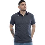 Remera polo masculina de manga corta en color azul marino, diseñada para ofrecer un look elegante y moderno en cualquier ocasión casual o semiformal. Presenta un sutil patrón de rayas horizontales finas en tono claro, que añade textura y sofisticación sin sobrecargar el diseño. Cuenta con cuello clásico con tapeta de botones oscuros, y detalles en ribete rojo y blanco en el cuello y los puños de las mangas, ofreciendo un contraste distintivo que resalta su estilo.