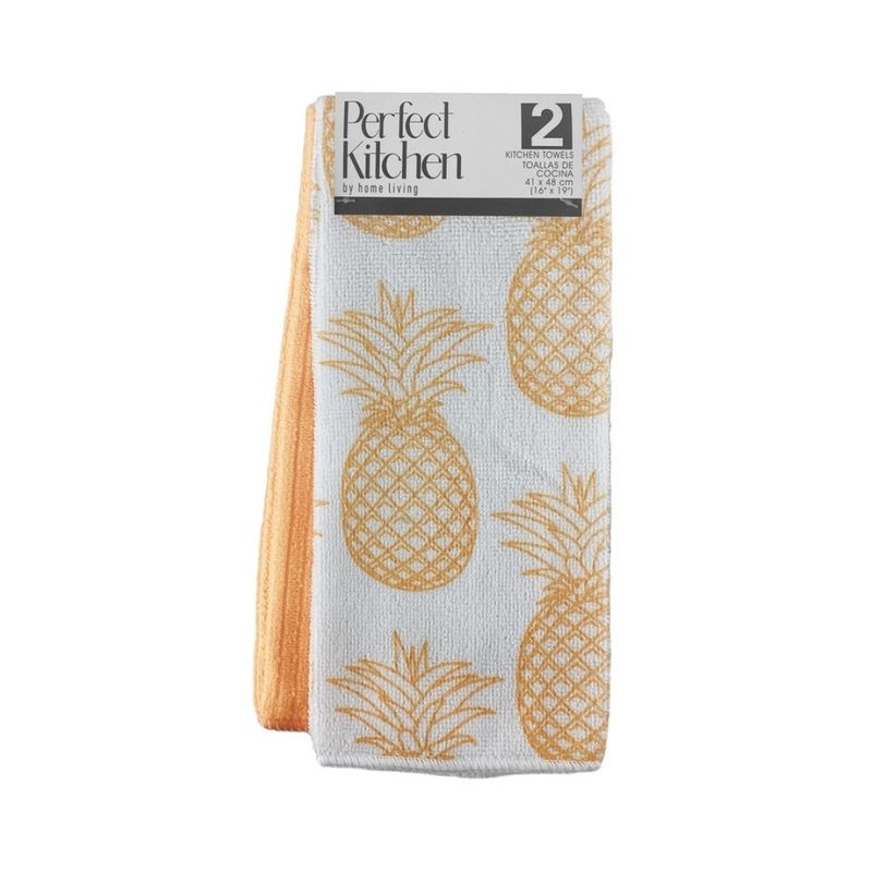 Set Toallas de Piñas (Amarillo/Blanco): Una toalla amarilla sólida y otra blanca con estampado de piñas, perfecta para agregar un toque alegre y decorativo a la cocina mientras se secan manos, utensilios o superficies.