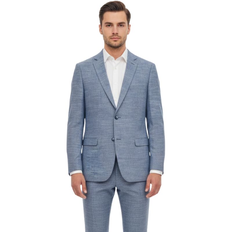 Saco de lino con codera en los codos, en tono azul claro melange, que combina un estilo clásico con detalles modernos. Ideal para ocasiones semiformal o eventos casuales que requieren un toque de elegancia y distinción. Su corte favorecedor proporciona comodidad y libertad de movimiento.