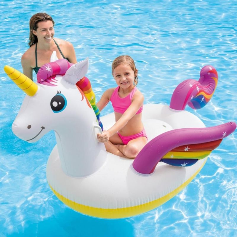 Flotador montable adulto con diseño de unicornio.