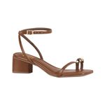 Esta sandalia presenta punta cuadrada y tacón de bloque bajo, ofreciendo estabilidad y confort en cada paso. Cuenta con una tira fina que cruza los dedos, adornada con un aro dorado que resalta el diseño. La tira de tobillo ajustable con hebilla asegura un calce seguro y personalizado. Fabricada con material duradero y resistente, garantiza longevidad y resistencia al uso diario.