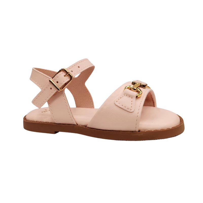 Presenta un diseño infantil prolijo y femenino, con tira frontal decorada con un detalle de eslabón dorado que realza la estética del calzado. El ajuste con hebilla regulable permite un calce seguro y adaptable, ideal para el pie en crecimiento.