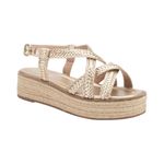 La Sandalia Con Plataforma Forrada De Tela Dorado de Lia Line combina modernidad y sofisticación con un toque artesanal. Su acabado metálico dorado aporta un brillo elegante, mientras que la plataforma tipo yute forrada en fibra natural genera un contraste atractivo y auténtico. El diseño incluye múltiples tiras trenzadas que se cruzan sobre el empeine, creando una silueta estructurada y llamativa, ideal para mujeres que buscan un calzado versátil, cómodo y con estilo. La pulsera ajustable al tobillo con hebilla metálica asegura un calce firme y elegante, aportando seguridad y soporte al caminar.