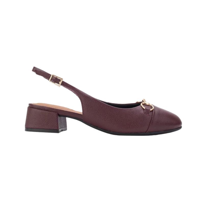 La Sandalia Mary Bordo es un calzado femenino de tacón bajo, diseñado en estilo slingback, combinando elegancia y comodidad. Su punta cerrada ligeramente afilada y la tira ajustable en el talón con hebilla ofrecen un ajuste seguro y un diseño sofisticado.