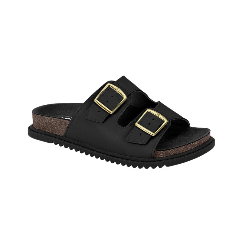 El color negro liso aporta versatilidad, facilitando la combinación con distintos atuendos, desde looks casuales hasta conjuntos más formales. La sandalia se completa con una plantilla de corcho marrón oscuro, que brinda comodidad y amortiguación, y una suela dentada negra que asegura estabilidad y tracción en diferentes superficies.
