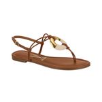La sandalia plana Vizzano en tono marrón es ideal para mujeres que buscan un calzado cómodo y con un diseño fresco y veraniego. Presenta una tira que se bifurca en el dedo gordo, conectada a un aro decorativo metálico dorado con detalles entrelazados en color crema, aportando un toque distintivo y elegante. Además, cuenta con una correa fina ajustable al tobillo con hebilla, que permite un calce seguro y personalizado, complementando la ligereza y estilo del modelo.