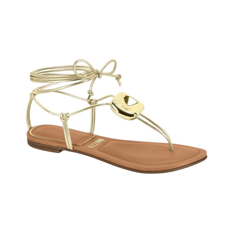 La sandalia plana Vizzano en tono dorado es una opción sofisticada y fresca para mujeres que buscan combinar comodidad con un estilo veraniego y elegante. Este modelo presenta una tira que se bifurca en el dedo gordo, unida por un delicado y llamativo adorno metálico dorado, que aporta un toque de distinción. Además, cuenta con múltiples tiras finas que se extienden para atarse alrededor del tobillo o la pierna, permitiendo un ajuste personalizado y un acabado estilizado y moderno.
