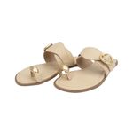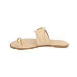 Sandalia plana de diseño moderno y minimalista que destaca por su elegancia sutil. Su estilo toe ring con detalle metálico en el dedo aporta un toque sofisticado, mientras que la banda ancha con hebilla dorada decorativa eleva el look, haciéndola ideal tanto para ocasiones casuales como más arregladas.