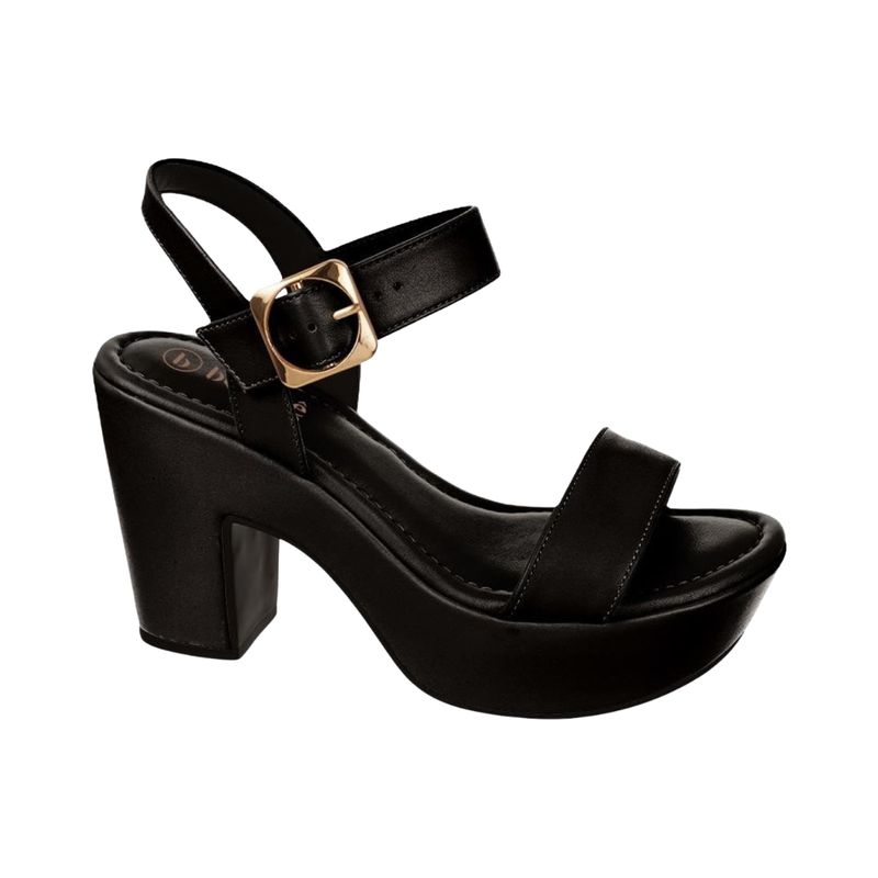 Con un tacón grueso que proporciona mayor estabilidad y una plataforma delantera que reduce la inclinación del pie, esta sandalia es ideal para lucir altura sin renunciar al confort. Presenta una tira ancha sobre los dedos y una correa que rodea el tobillo con una hebilla cuadrada de color dorado, aportando un detalle llamativo y femenino. El diseño en color negro la vuelve versátil y fácil de combinar.