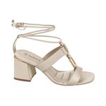 La Sandalia Taco Grueso Detalles Dorados Marfil Mujer Bebece se destaca por su elegancia y estilo único. Este modelo presenta una tira ancha en la parte delantera decorada con detalles metálicos dorados que aportan un toque sofisticado y moderno. Las correas finas que se atan al tobillo permiten un ajuste personalizado y realzan la feminidad del diseño.