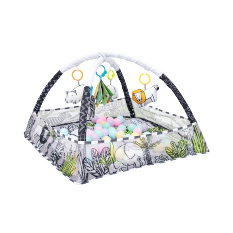 El gimnasio permite cuatro formas de juego: acostado boca arriba, boca abajo, sentado o explorando los juguetes colgantes. Sus colores vibrantes, cinco juguetes removibles y pelotas interactivas despiertan la curiosidad del bebé, fomentando el aprendizaje a través del juego y asegurando horas de entretenimiento activo y estimulante.