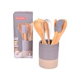 Incluye 8 piezas: espátula de silicona, cucharas y utensilios de bambú, batidor de acero inoxidable y soporte de cerámica. Cada utensilio tiene tamaño adecuado para un manejo cómodo y seguro, mientras que el soporte permite mantener todo ordenado y accesible durante la preparación de alimentos.