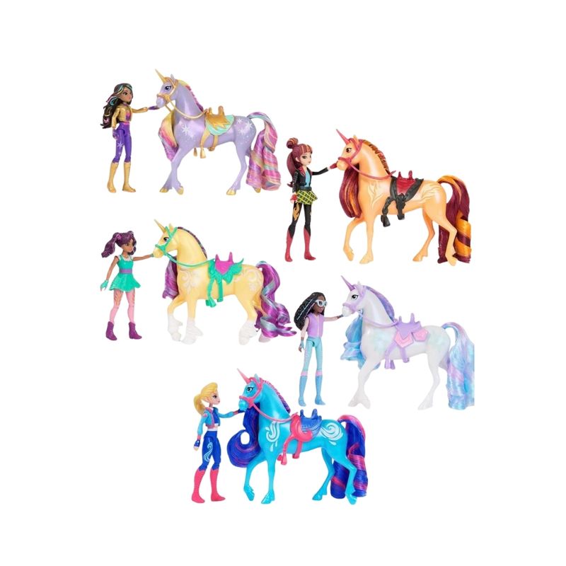 El Set de Figuras Unicornio y Jinete Surtidos de Unicorn Academy, de la serie original de Netflix, es perfecto para que los niños vivan aventuras mágicas con Ava, la protagonista, y su unicornio Leaf. Este set incluye figuras detalladas y accesorios que permiten recrear escenas llenas de fantasía y diversión, ideal para estimular la imaginación y el juego simbólico.