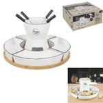 Completa tus utensilios con este Cuenco Porta Fondue de Bambú fabricado en metal. Viene con 4 tazas y una caja, diseñado para tu comida. Su soporte de color natural está hecho de bambú.