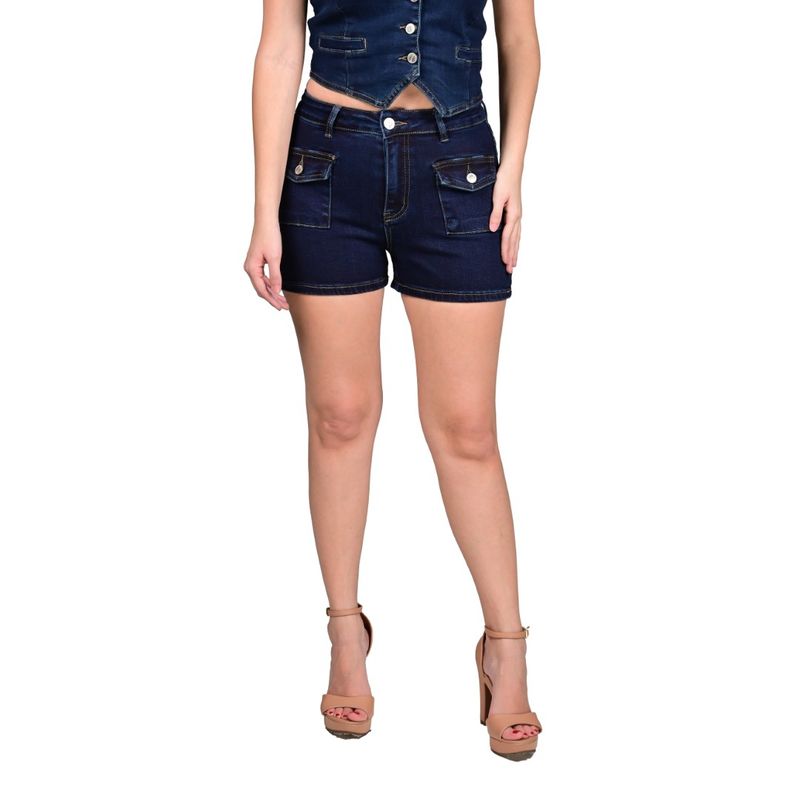 El Short Cargo Denim Shorts Azul Oscuro Mujer Tiare combina la funcionalidad del estilo cargo con la versatilidad de la mezclilla. De tiro alto y corte ajustado, este short destaca por sus dos grandes bolsillos de parche frontales con solapa y botón, que aportan un toque moderno y práctico al diseño. Ideal para looks urbanos y casuales.