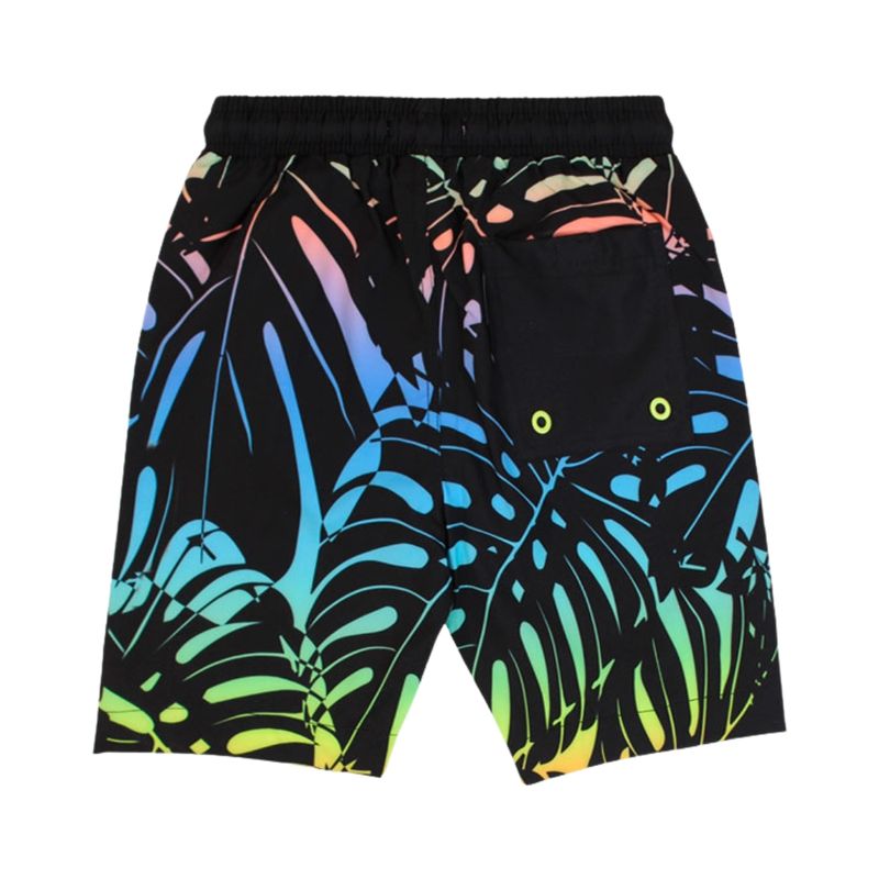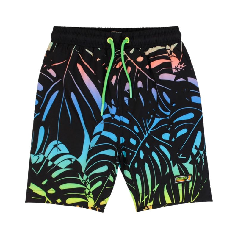 Este Short de Baño Beach Squad para niños combina estilo urbano con comodidad para la playa, piscina o actividades al aire libre. Su diseño presenta un estampado all-over de hojas tropicales Monstera con efecto arcoíris/holográfico, que le aporta un toque moderno y divertido. La cintura elástica con cordón neón permite un ajuste seguro y cómodo, mientras que el bolsillo trasero de parche brinda funcionalidad adicional.