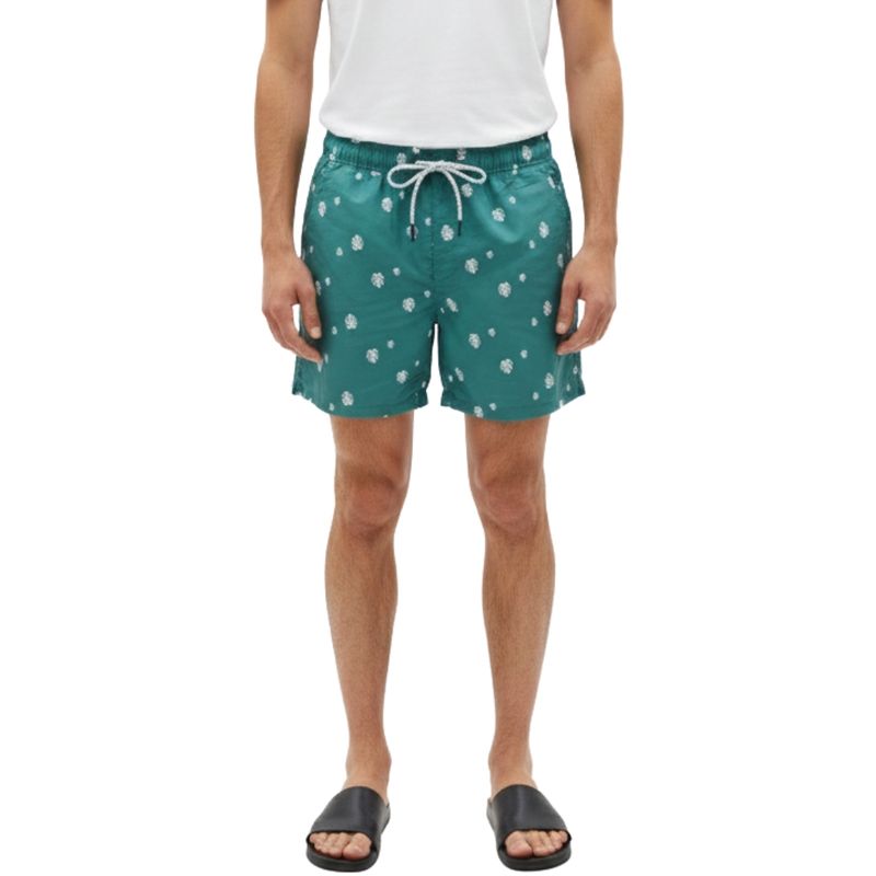 Short de baño con estampado de hojas en tonos Verde Agua y Blanco, diseñado para brindar un look fresco y moderno durante el verano. Su corte cómodo y cordón ajustable garantizan un calce seguro, ideal para disfrutar de la playa, la piscina o actividades al aire libre.