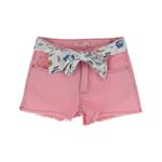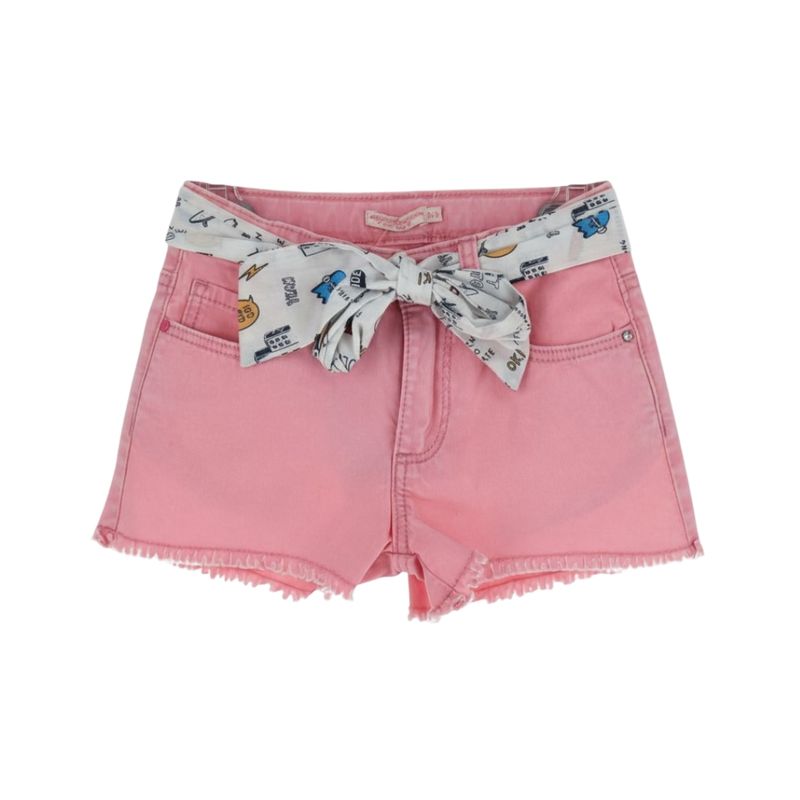 El Short Denim Con Pañoleta Rosa Niña Original Marines es una prenda moderna y versátil para el guardarropa infantil. De color rosa con efecto desgastado, presenta un bajo deshilachado que le da un toque casual y actual. Su diseño incluye cinco bolsillos funcionales y se completa con un cinturón de tela estampado con lazo y dibujos en azul, agregando un detalle divertido y femenino.