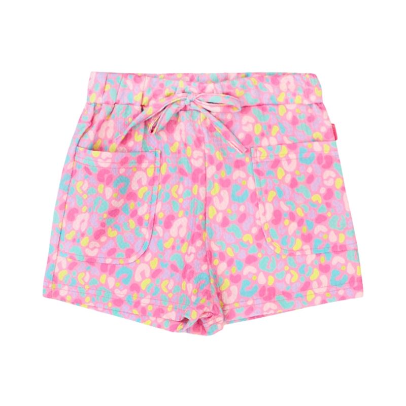 Short urbano para niñas, ideal para el día a día y actividades casuales. Este short estampado con diseño de leopardo en colores brillantes y pastel combina tonos de rosa, lila, turquesa y amarillo neón, aportando un toque moderno y divertido al outfit. Su cintura elástica con lazo decorativo facilita el ajuste y agrega un detalle encantador, mientras que los bolsillos frontales suman funcionalidad y practicidad.