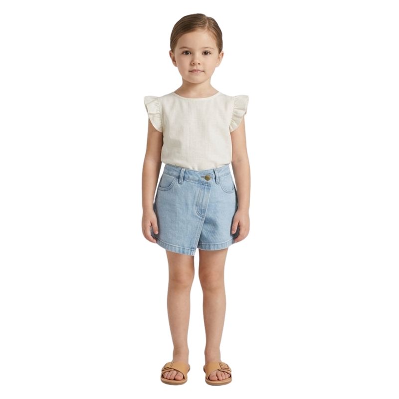 El Short Pollera Cruzada Celeste combina la comodidad de un short con el diseño femenino de una pollera cruzada, ofreciendo un look moderno y versátil para niñas. Su color celeste aporta frescura y facilidad para combinar con remeras de distintos colores y estampados, ideal para el uso diario y actividades recreativas.