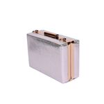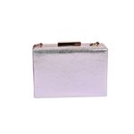 Los bordes, el cierre superior y los enganches para la cadena están en tono dorado rosado pulido, creando un contraste sutil y elegante con el plateado metalizado del bolso. El cierre de broche metálico simple asegura el contenido con estilo y funcionalidad.
