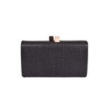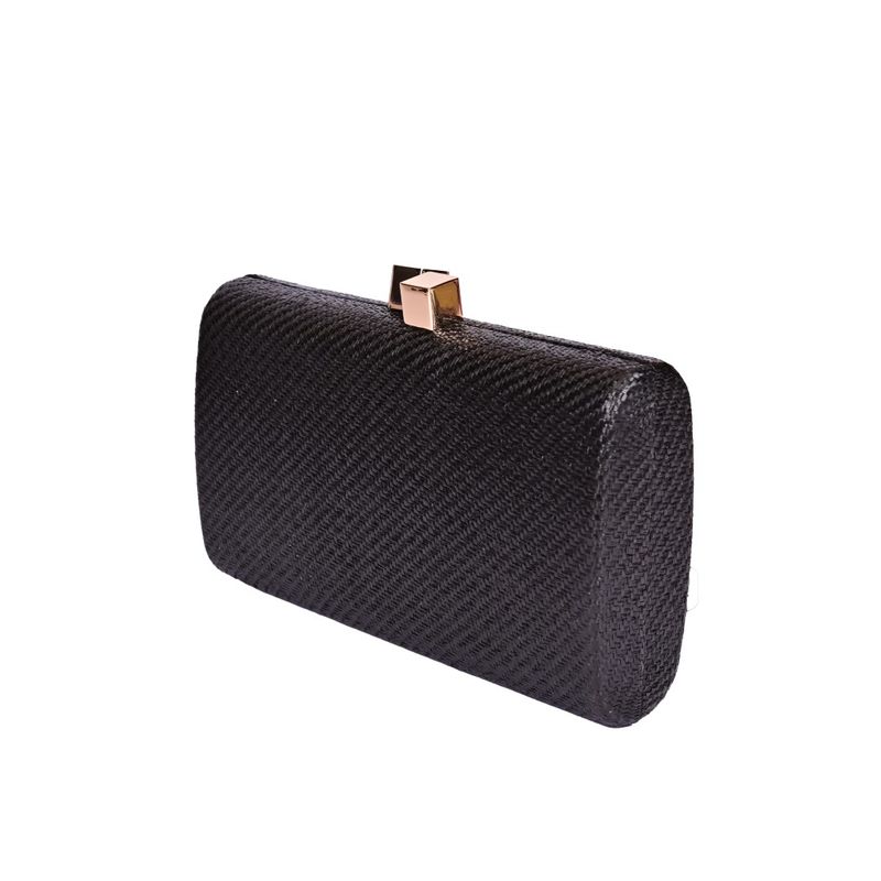 El Sobre Tejido Negro De Playa Fashion Celina es un clutch elegante y sofisticado, ideal para ocasiones casuales y eventos veraniegos. Su superficie presenta una textura tipo canasta o mimbre con un patrón de diamantes que aporta un toque moderno y distinguido. Los herrajes dorados complementan el diseño, haciendo de este accesorio un complemento versátil y con estilo, perfecto para combinar con outfits de playa, resort o salidas diurnas.